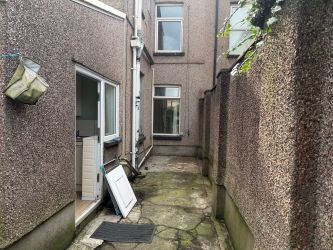 Enclosed paved garden and shed to rear