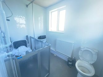 SHOWER-ROOM: Enclosed shower cubicle, double-glazed window to rear and side, pedestal wash hand basin and WC.