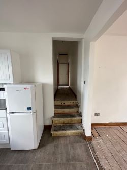KITCHEN: 11’0 x 10’6 – A selection of wall and base units, stainless steel sink and drainer, space for cooker and washing machine, extractor hood and tiled splashback uPVC double glazed window to rear, radiator. Step and doorway to hallway leading to bedrooms, bathroom as well as airing cupboard housing the boiler.